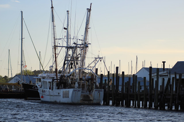 Well we arrived in Oriental around 1430 and tried several times to drop the anchor in the harbor. It was very windy, the water was shallow and the anchor was not holding well. We felt that if we stayed there we would be aground. We called the marina for a slip and they assured us we had plenty of depth for our 6 foot draft. Not so... we ended up being aground in the slip! Fortunately, the water was higher in the am and we got right out. The seabirds always follow the shrimpers - this boat seemed to be a particular favorite. Better fisherman??